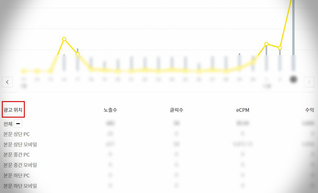 수익그래프는 [광고 위치]에 따른 노출수, 클릭수와 eCPM등의 수익을 구분해서 보여줍니다. CPM이 단순한 계산((Cost/impressions)*1000)인데 비해 eCPM은 ( (Total Ad SpendTotal Mesured Ad/ Impressions)*1000)이라고 합니다. 아직 정확한 개념은 모르겠으나 더 정밀한 측정치인 것 같아요.