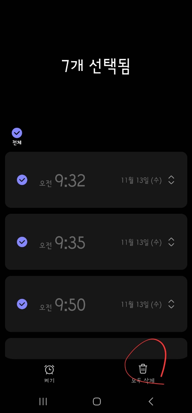 3. 화면 하단의 ‘삭제’ 아이콘을 선택하여 불필요한 알람을 제거합니다.