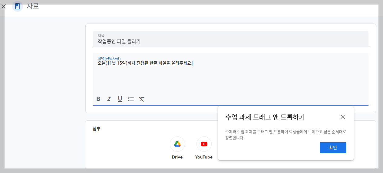 Google 드라이브, 링크, 파일, YouTube 동영상을 첨부할 수 있습니다. 드라이브의 문서나 시트, 프레젠테이션 등을 선택하여 과제에 활용할 수 있도록 합니다.