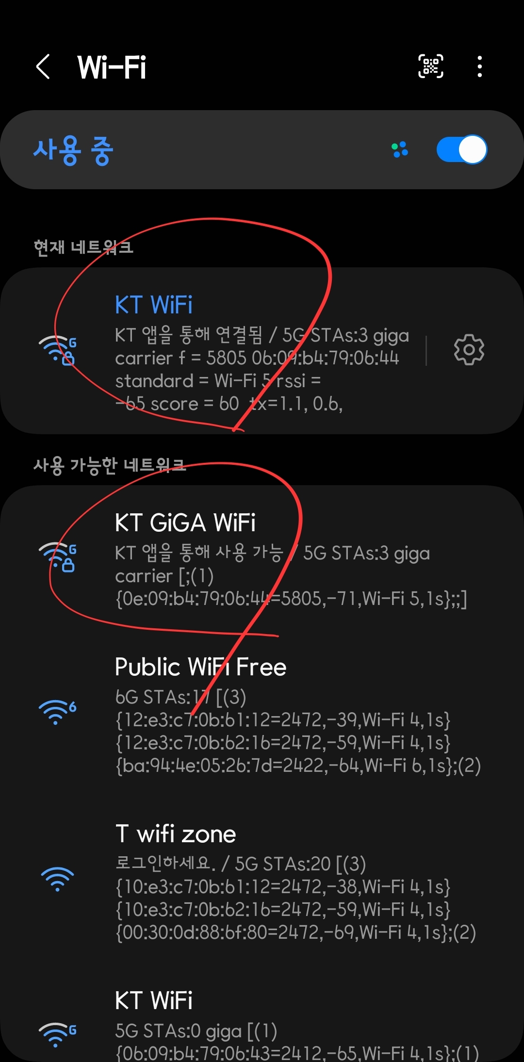 제공되는 Wi-Fi 이름 목록에서 통신사 Wi-Fi를 선택합니다. 예: KT WiFi, T wifi zone, U+ WiFi.