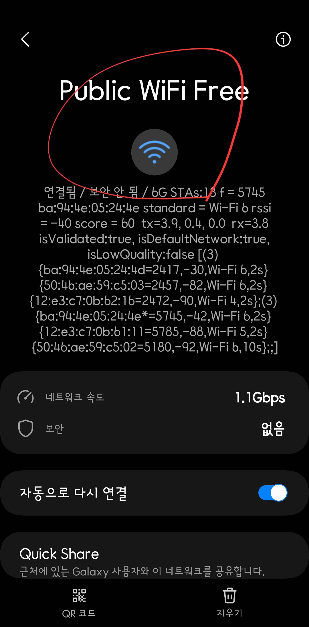 예시 이미지에서 속도가 1.1Gbps로 표시되지만, 실제 체감 속도는 제한적일 수 있습니다.