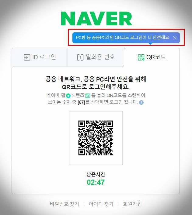 도서관에서 네이버를 사용했는데, 나중에 친구한테서 연락이 왔다구요. 친구가 도서관 컴퓨터를 이용하는데 크롬에서 네이버를 열었는데, 형님 아이디와 비번이 떡 기록되어 나왔다구요. 그렇습니다. 로그아웃을 확실하게 하지 않고 종료를 한다든가 했을 때 발생하는 문제입니다. 이런 문제를 해결하기 위해 서비스되는 것이 QR코드 로그인입니다. QR코드로 로그인하면 PC에 아이디와 비번 기록이 남지 않게 됩니다.