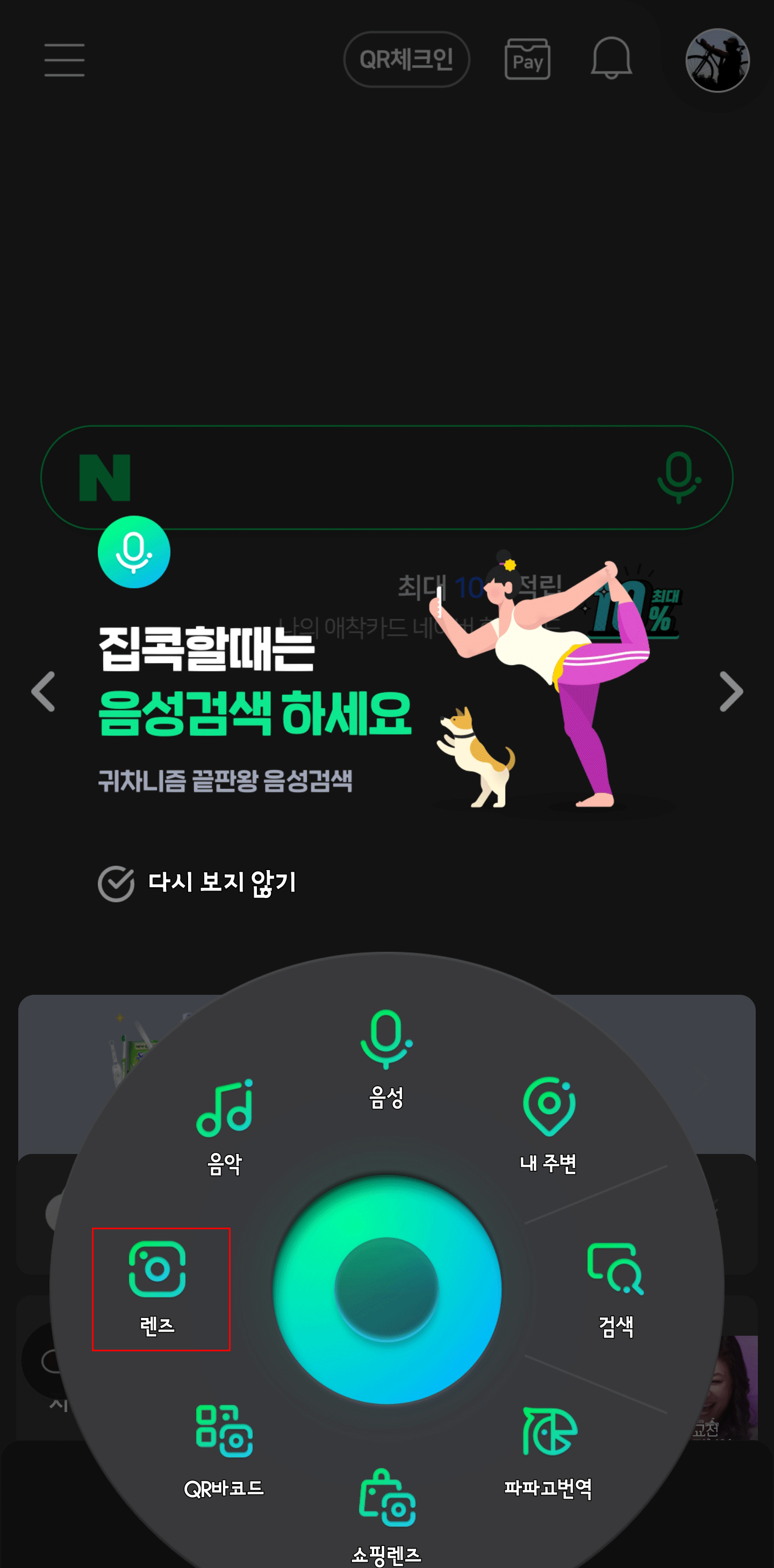 스마트폰에서는 네이버를 선택하고 아래 가운데에 있는 [그린닷]을 선택합니다. 그리고 [렌즈]를 선택하면 아래에 멱가지 옵션이 나옵니다. 그중에서 [[QR/바코드]를 선택합니다.