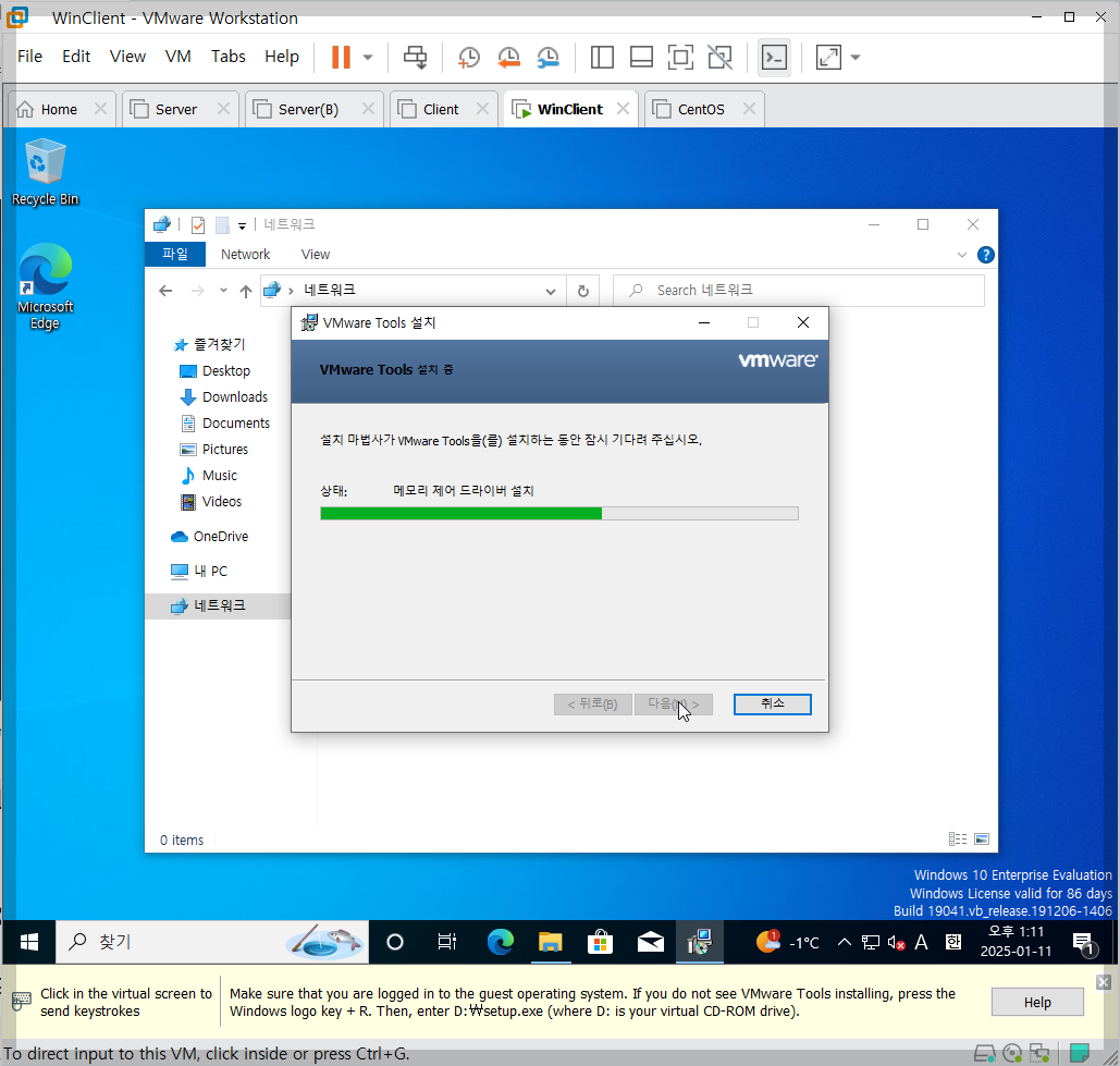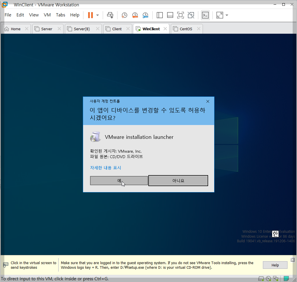 - VMware Tools가 설치되지 않으면 커서를 이동할 때마다 클릭으로 입력 전환이 필요합니다.
