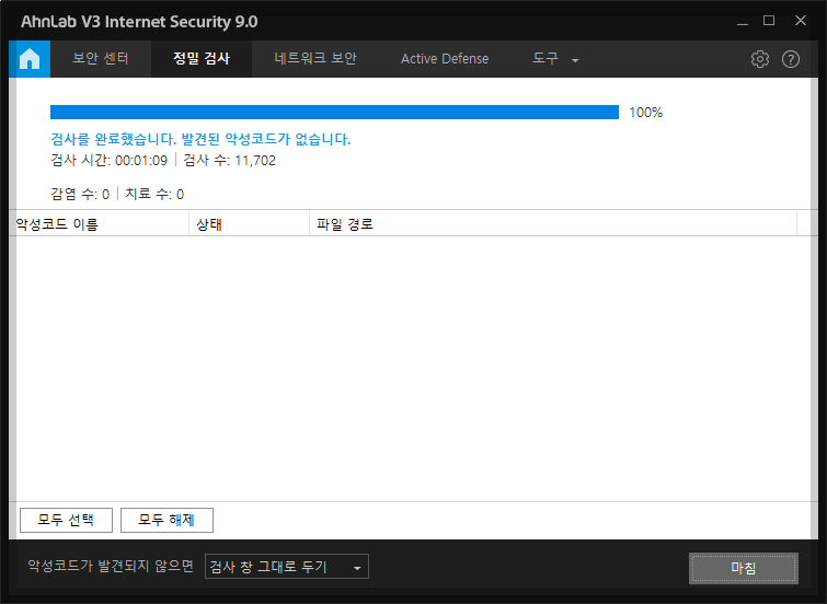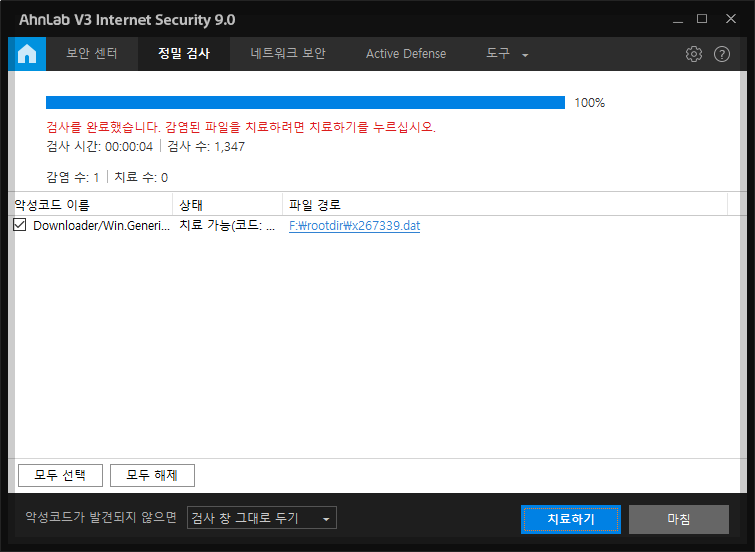 바이러스 치료를 위해서는 바이러스를 퇴치하는 백신 프로그램에서 바로 '치료하기'를 선택하여 치료할 수 있습니다. 다음은 USB를 검사해서 치료한 결과 화면입니다. '마침' 버튼으로 백신 프로그램을 종료합니다.