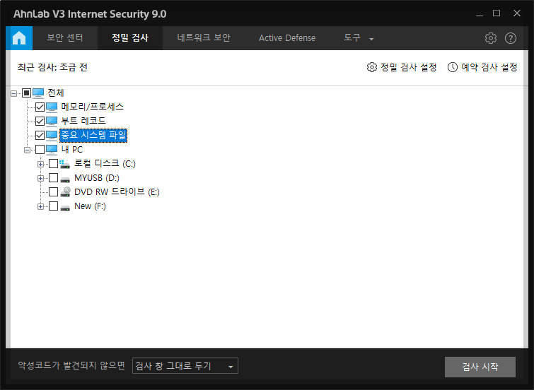 바이러스가 어디까지 침투했는지 모르기 때문에 '정밀 검사'를 합니다. 아래는 '메모리', '부트 레코드', '중요 시스템 파일'을 선택하여 정밀 검사를 시작하기 위한 화면입니다. 이런 방식으로 USB를 선택하여 검사를 합니다. 검사 결과, 바이러스 감염이 확인되면 바이러스 감염 파일을 삭제합니다.