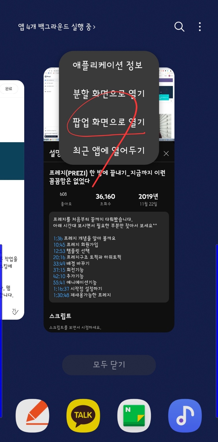 앱 전환: 팝업화면을 끄지 않고 다른 앱을 실행해도 기존 팝업화면이 유지되므로 빠르게 작업을 전환할 수 있습니다.