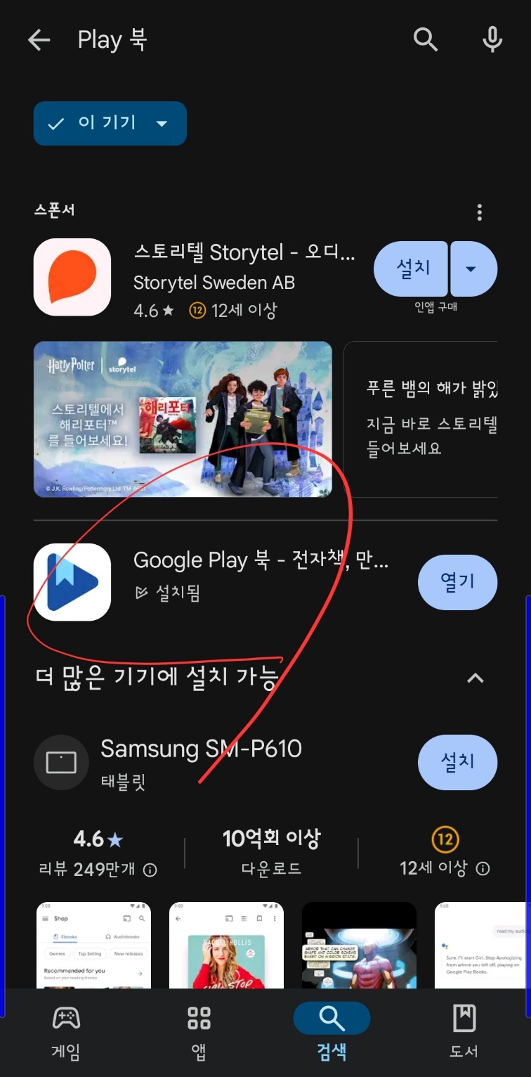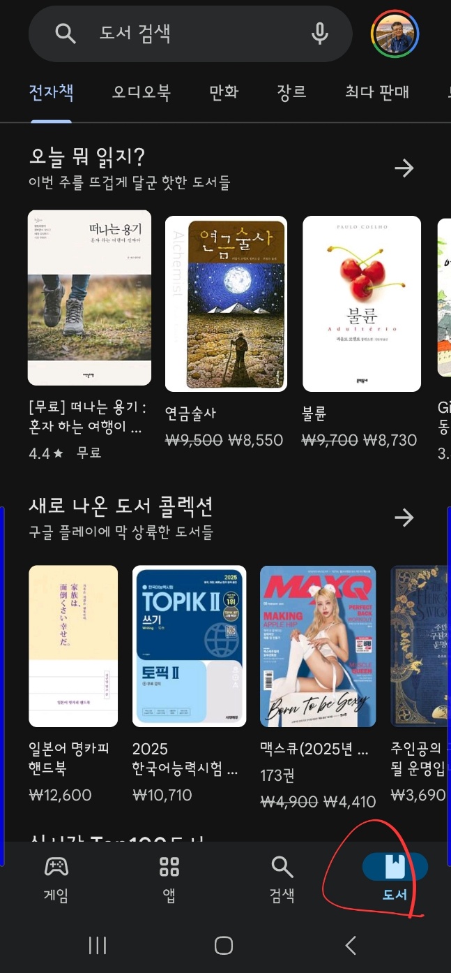 먼저 구글 '플레이스토어'를 엽니다. 플레이스토어 하단 맨 우측에 '도서' 버튼이 있습니다. 구글은 어플과 함께 영화와 도서도 온라인 서비스를 함께 공급합니다.