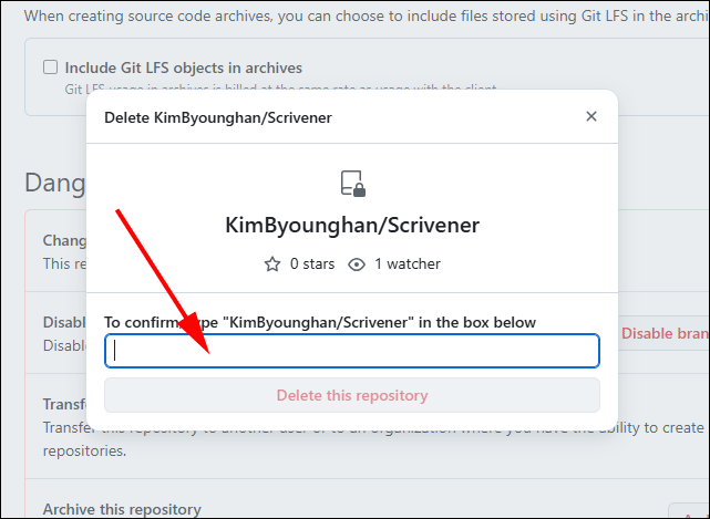 KimByounghan/Scrivener)을 입력한 후 "I understand the consequences, delete this repository" 버튼을 클릭합니다.