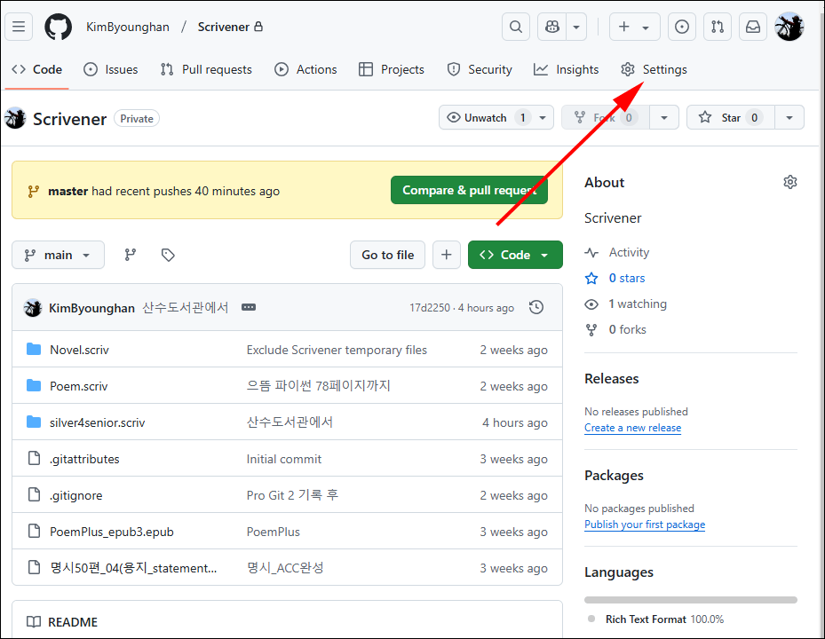 리포지터리 설정 (Settings)으로 이동