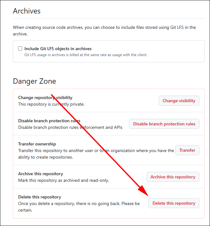 - 페이지 하단으로 스크롤하면 "Danger Zone" 섹션이 있습니다.