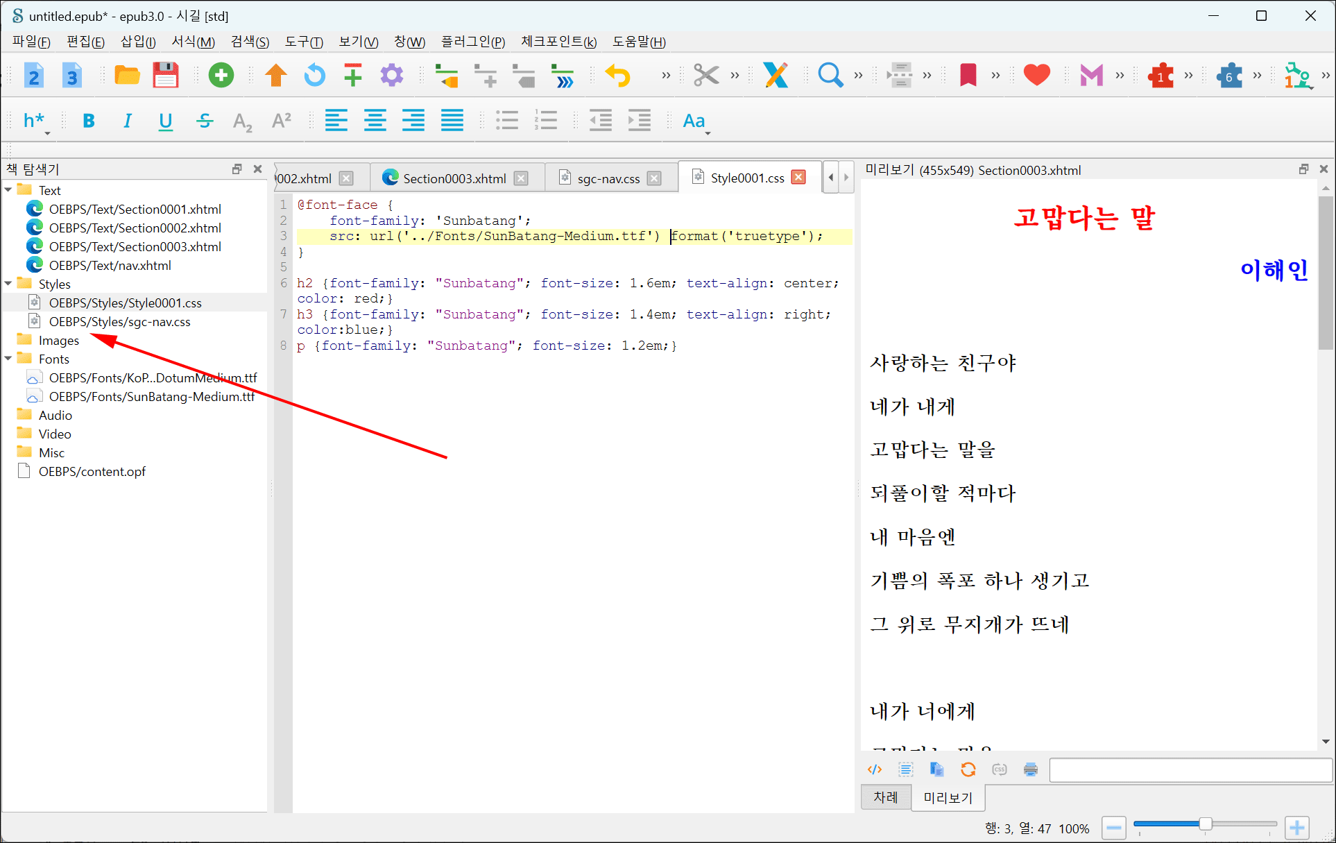 예를 들어, 폰트가 OEBPS/Fonts/SunBatang-Medium.ttf에 있다면: