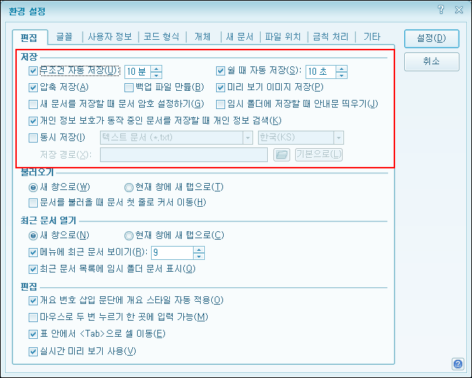 한컴오피스는 비정상 종료 시 자동 복구 파일을 저장합니다.