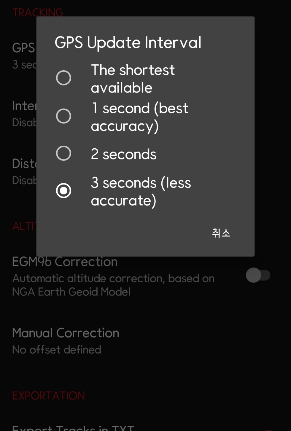 위 이미지는 GPS 업데이트 간격(GPS Update Interval)을 설정하는 메뉴입니다. GPS 업데이트 간격은 위치 정보를 얼마나 자주 갱신할지를 결정합니다.