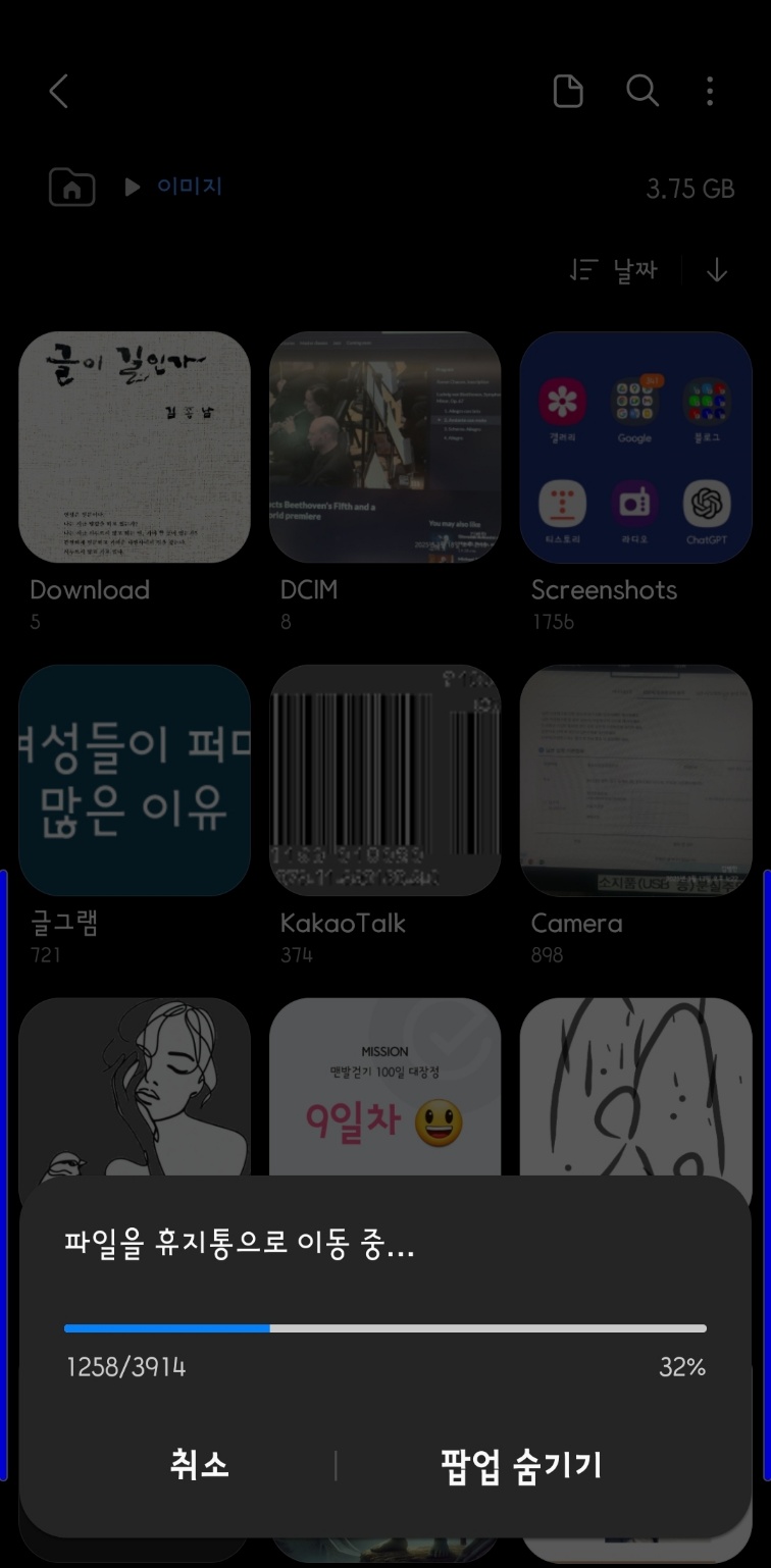 물론 휴지통까지 비워야 메모리 공간을 확보할 수 있습니다. 제 폰은 127/128로 거의 꽉 찼었는데 이미지 4,000장을 버렸더니 4기가 정도 여유가 생겼네요. 요즘 스마트폰은 숨통이 조금만 열려도 사용에 지장이 없습니다.