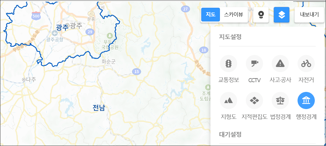 예를 들어 광주의 경우, 법정동으로는 '상무1동', '상무2동'이 있지만, 행정적으로는 하나의 '상무동 행정복지센터'에서 관리할 수 있습니다. 이때 지도에서 '법정경계'와 '행정경계'를 선택하면 서로 다른 경계선을 확인할 수 있습니다.