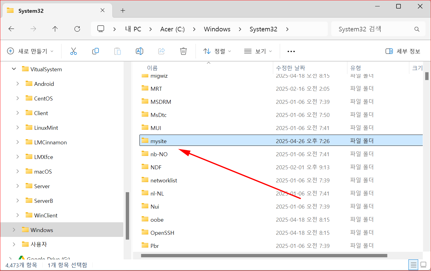 - mysite 폴더를 마우스 오른쪽 버튼으로 클릭 → 삭제를 선택합니다.