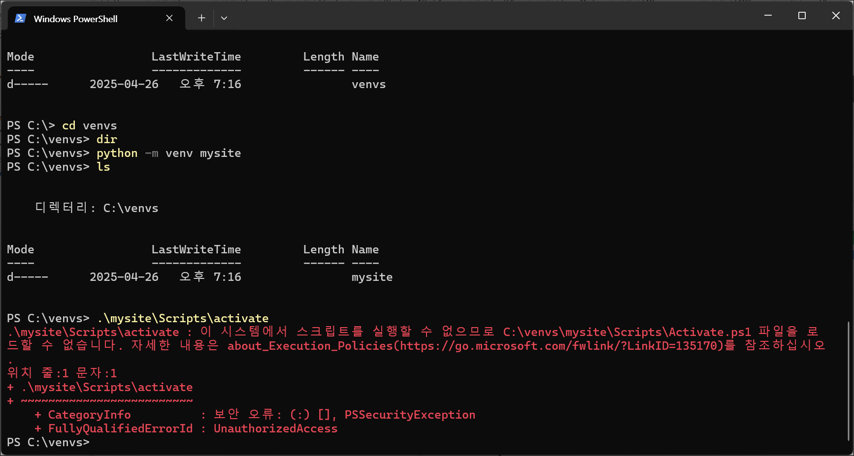 화면에 나타난 오류는 PowerShell의 실행 정책(Execution Policy) 때문에 가상환경 활성화 스크립트를 실행할 수 없다는 내용입니다. 보안상 기본 설정은 스크립트 실행을 막고 있기 때문입니다.