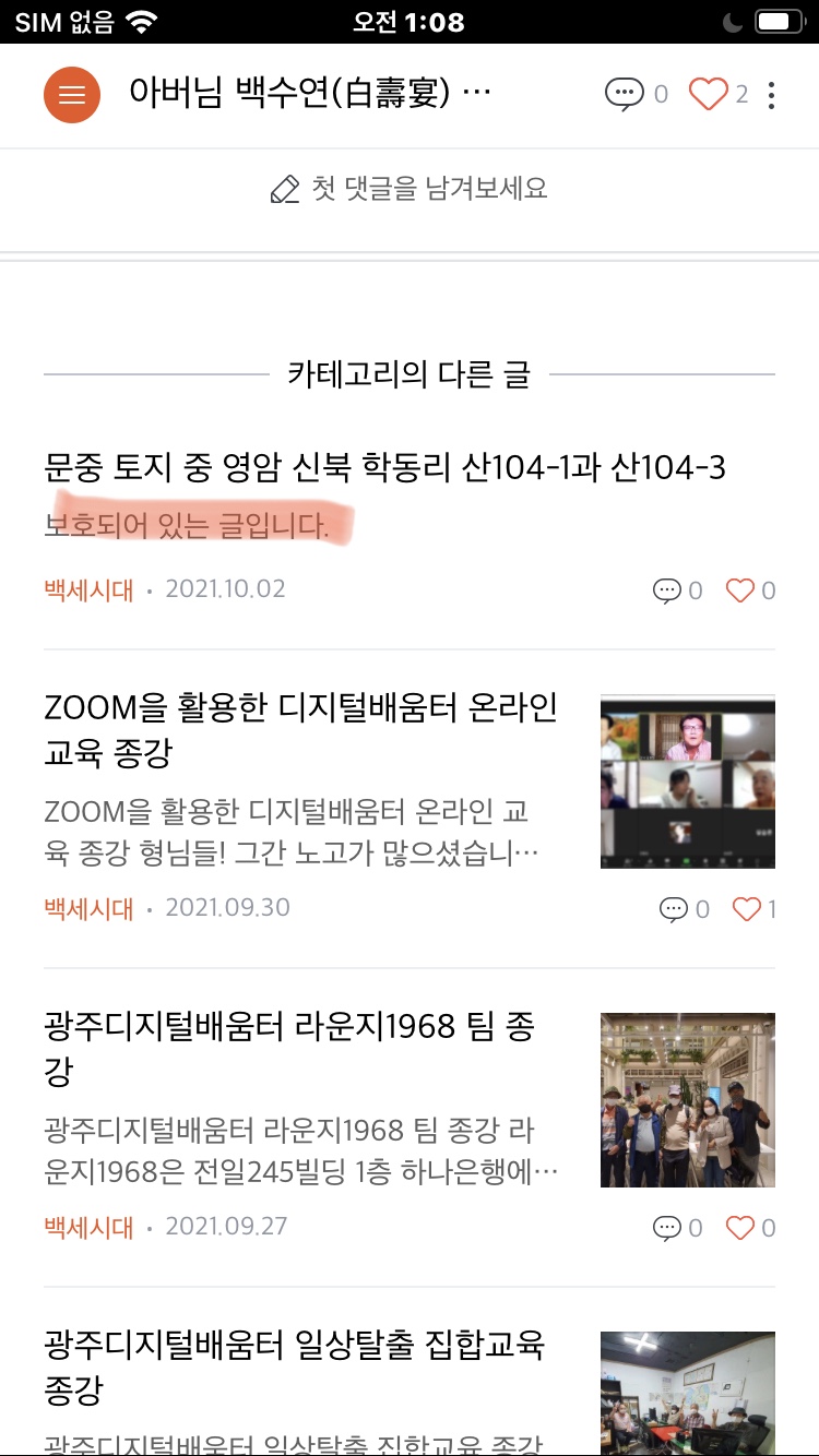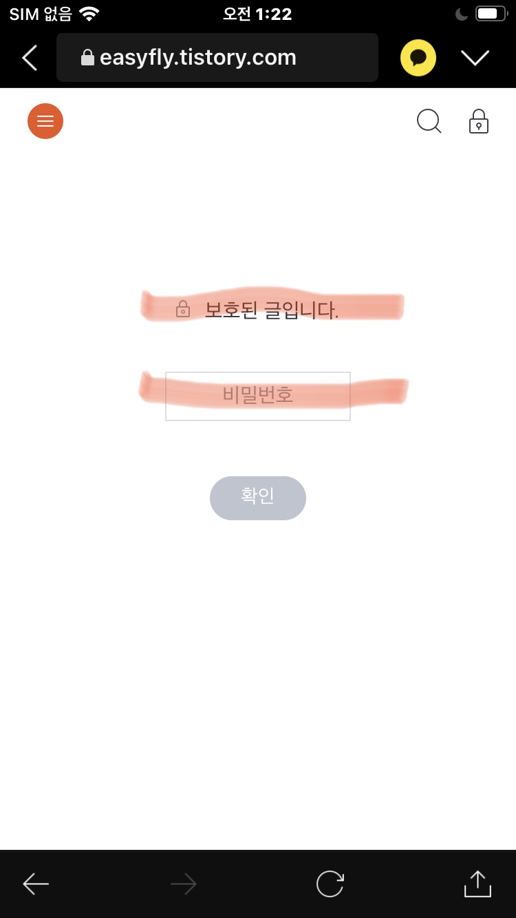티스토리 보호글. 과연 일반 구독자에게는 어떻게 보일까가 궁금하시다구요. 제 친구 아이폰을 통해 확인한 결과는 다음과 같습니다.