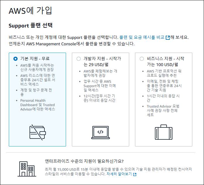 AWS는 사용량 기반 과금(pay-as-you-go) 방식으로, 필요한 만큼만 비용을 지불합니다. 시작 시에는 Basic Support 요금제(무료)를 선택하며, EC2, S3, RDS 등 주요 서비스는 Free Tier에서 12개월간 제한된 용량 내 무료로 이용할 수 있습니다.
