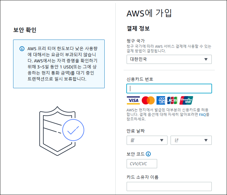 결제는 무료 티어라도 계정 인증을 위해 카드가 필요합니다. 소액(1달러 미만)이 승인 후 취소됩니다.(제 경우는 100원이 입금 됐다가 바로 취소)