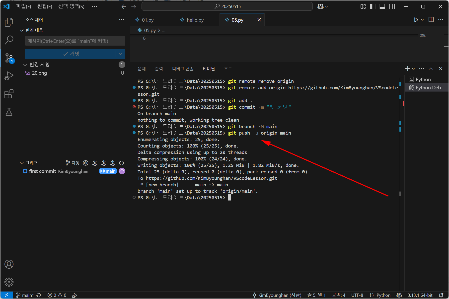 - 이후에는 git push 또는 git pull만 입력해도 자동으로 origin/main과 동기화됩니다.