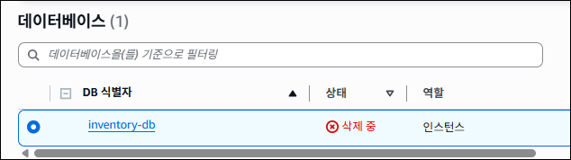 - RDS 콘솔 → 인스턴스 목록 → inventory-db 선택 → [작업] → 삭제