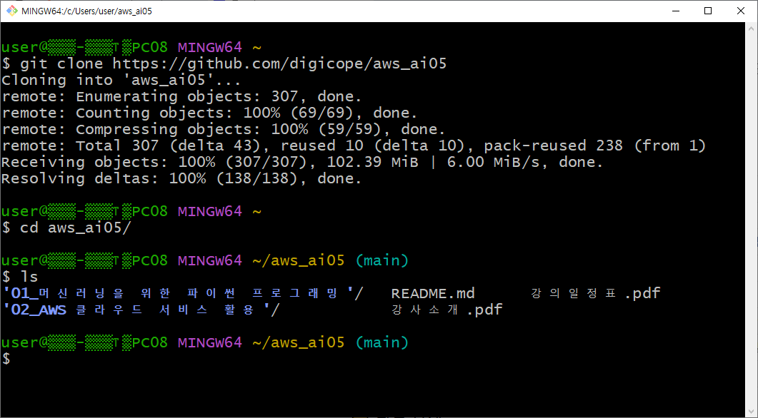 - 이 명령은 GitHub에 있는 aws_ai05라는 저장소(repository)를 로컬 컴퓨터의 현재 디렉터리에 복제(clone)한 것입니다.