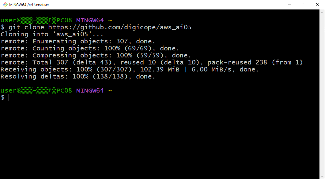 | cloning into 'aws_ai05'... | 로컬에 aws_ai05라는 폴더를 만들고 복제를 시작함 |