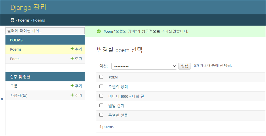 - 관리자 페이지 좌측 메뉴에서 Poems 항목 옆의 + 추가 버튼을 클릭합니다.