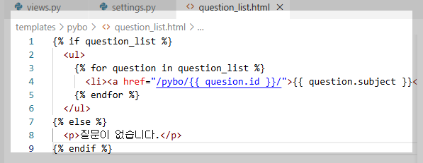 | 템플릿 태그 | 제어 로직 (if, for, url 등) | {% for item in list %} |