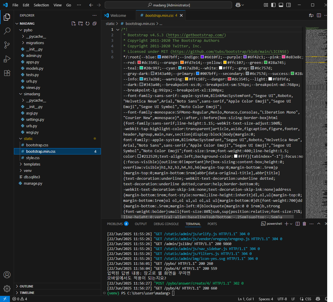 학습과 수정은 bootstrap.css로, 실제 운영은 bootstrap.min.css로 나누어 사용하는 것이 현명한 방법입니다.