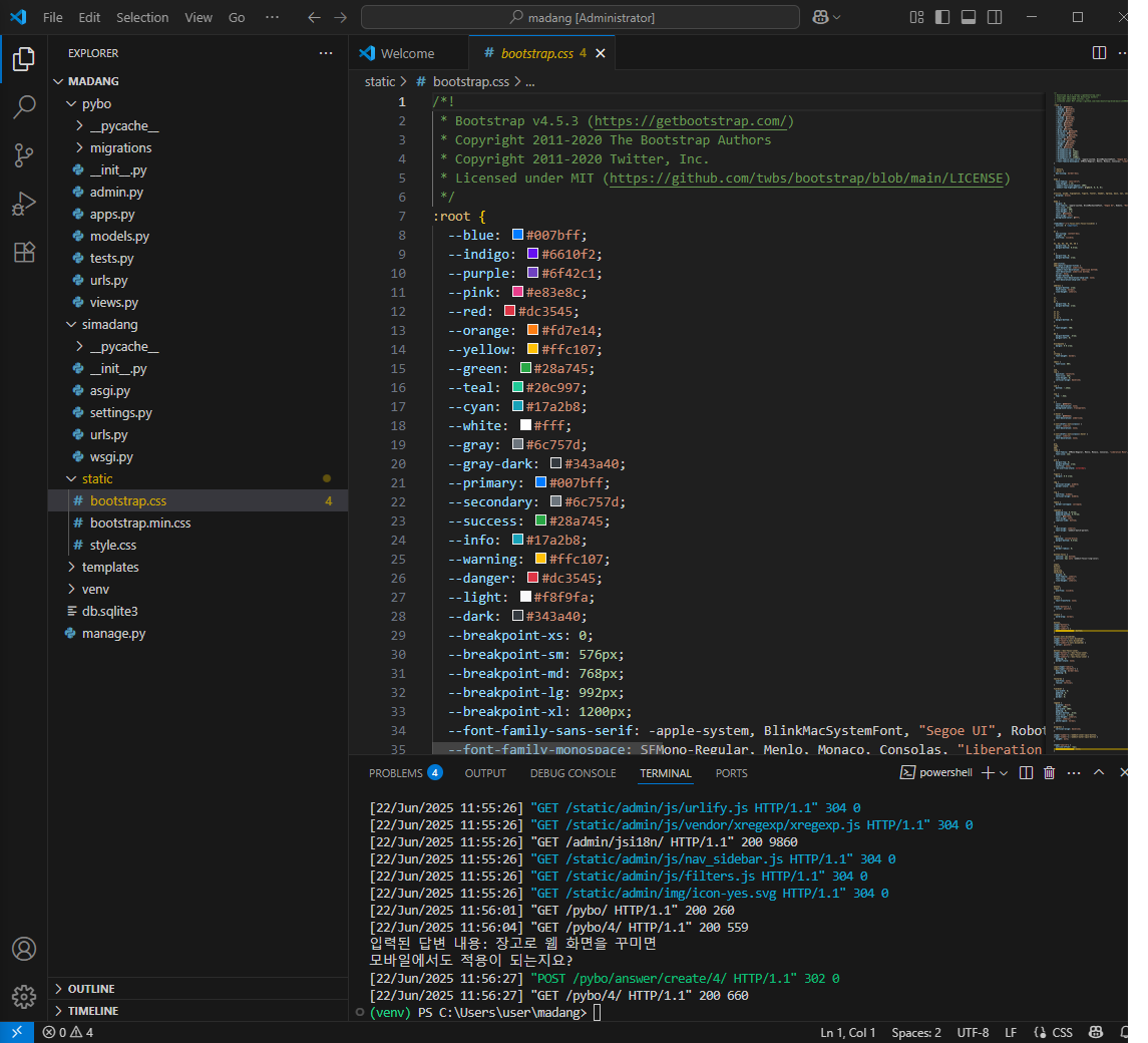 - 완성된 사이트를 배포하거나 성능이 중요할 때 → bootstrap.min.css