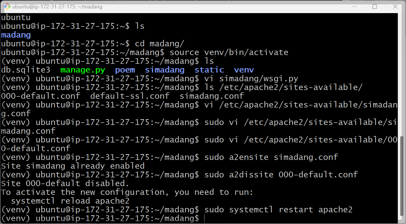 Django 프로젝트는 /home/ubuntu/madang 경로에 있고, Apache 설정 파일로는 /etc/apache2/sites-available/simadang.conf 를 사용하고 있습니다.