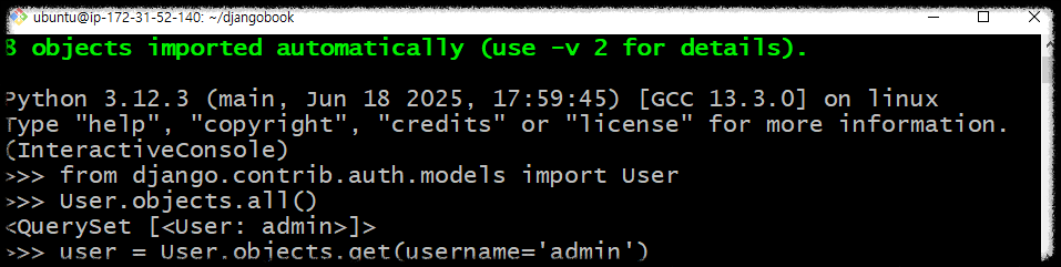 user = User.objects.get(username='admin') # admin 대신 사용자 이름