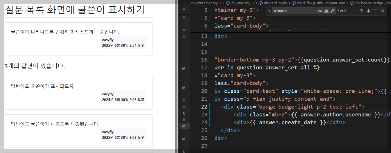 답변하기에도 답변글을 쓴 유저가 나타나도록 변경했습니다. 데이터베이스에 반영된 필드를 불러와서 웹페이지에 뿌려주는 방법입니다.