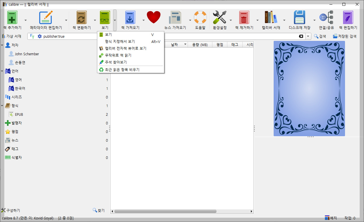 전자책 뷰어는 여러 종류가 있습니다. 특히 서적 유통을 담당하는 대형 서점은 독자적인 전자책 뷰어를 갖고 있습니다. 교보, 알라딘, 예스24 등. 그러나 보편적인 뷰어는 캘리버가 으뜸입니다. 캘리버는 전자책을 보는 뷰어뿐이 아니고 편집도 가능합니다.