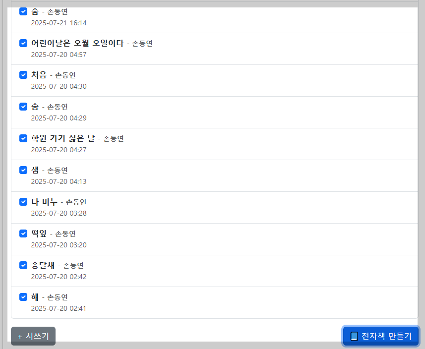 전자출판 도우미 '시마당'은 자신들의 시를 올리고 '전자책 만들기' 버튼만 누르면 바로 전자책 형식의 파일을 받을 수 있습니다. 마무리는 시길 편집기로 정교하게 다듬는 일만 남습니다.