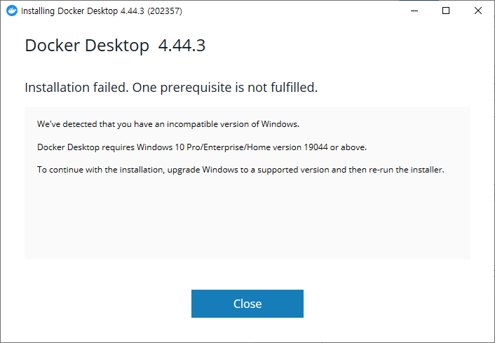 Windows 버전이 Docker Desktop 설치 요구사항을 만족하지 못하면 설치 결과, 다음과 같은 에러가 발생합니다. 결국 윈도우즈 사양이 어느 정도 뒷받침되어야 Docker Desktop은 사용할 수 있습니다.