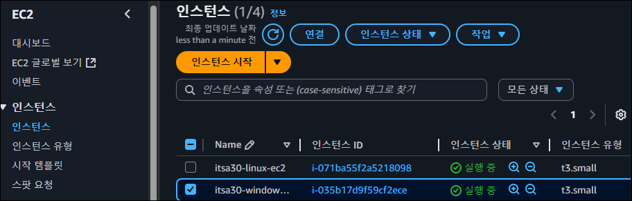 - 인스턴스 상태: EC2 콘솔 → 인스턴스 → 대상(예: itsa30-window-ec2) 선택 → 상태 검사 2/2 통과인지 확인합니다.