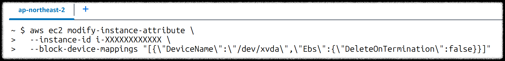 --block-device-mappings "[{\"DeviceName\":\"/dev/xvda\",\"Ebs\":{\"DeleteOnTermination\":false}}]"