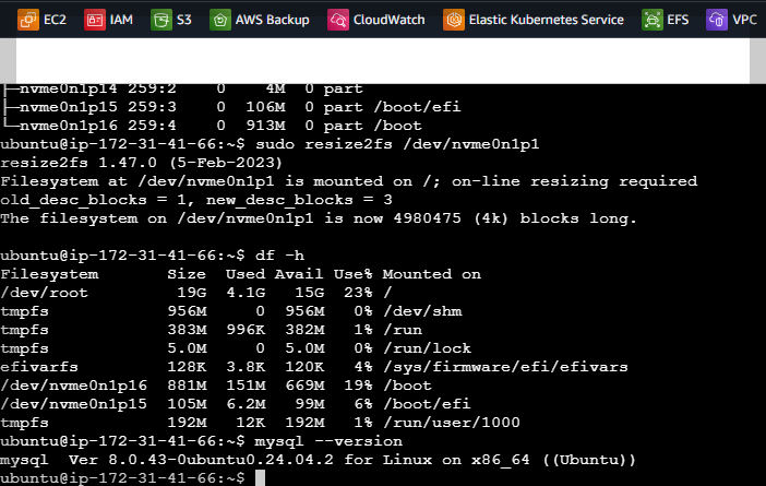👉 이제 루트 볼륨 공간이 충분히 확보되었으므로, MySQL 서버 같은 대용량 애플리케이션을 안심하고 설치할 수 있습니다.