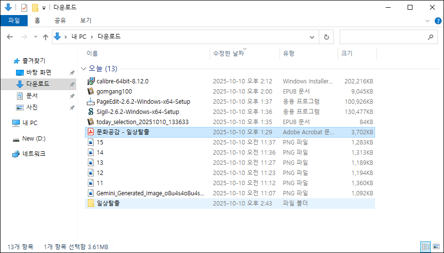 - gomgang100.epub, today_selection_20251010_133633.epub 같은 파일은 사용자가 직접 다운로드 또는 내보내기한 전자책입니다.