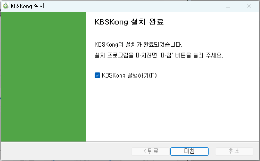 - 하단에 [KBSKong 실행하기] 체크박스가 기본으로 선택되어 있음