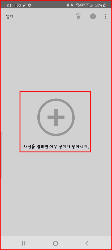 구글의 숨은 어플 스냅시드는 시작도 멋대가리 없이 시작됩니다. 그냥 보기에는 영양가 없어 보이는 회색 바탕에 동그라미 속에 + 기호 하나. { 사진을 열려면 아무 곳이나 탭 하세요. } 메시지 하나 덩그러니.