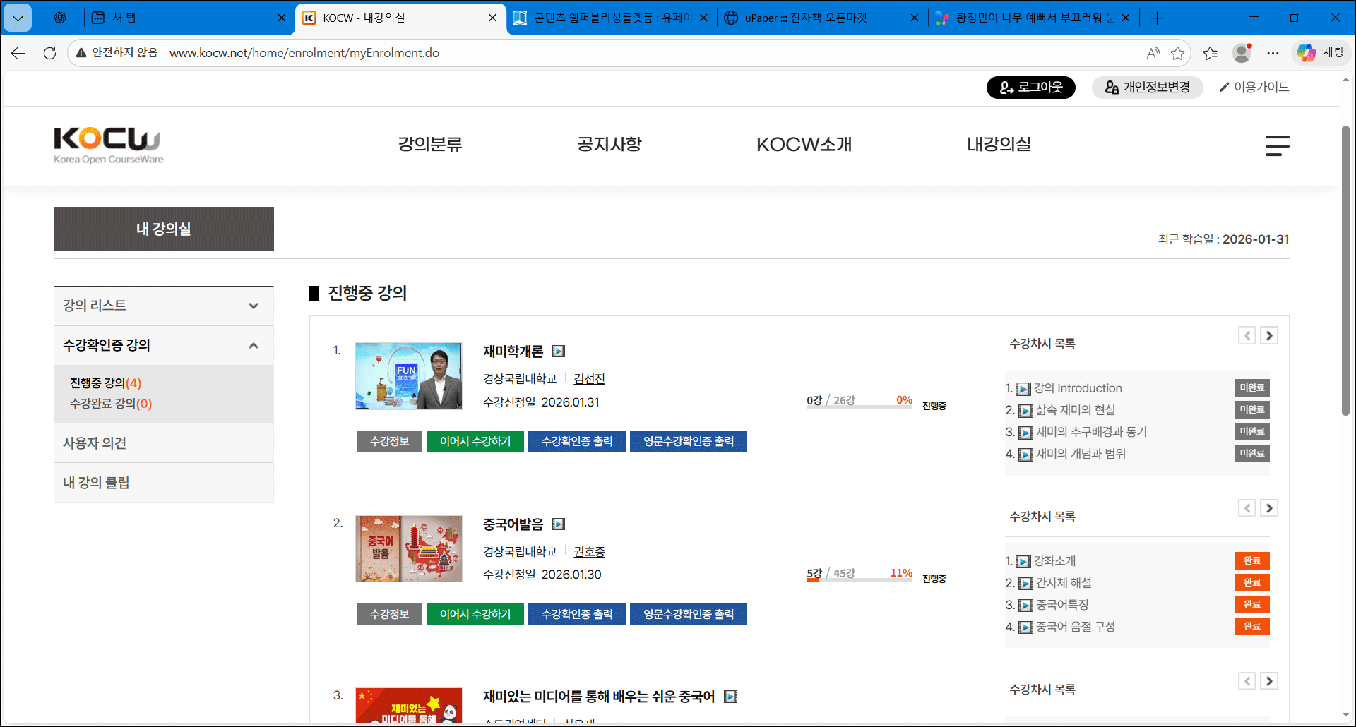 KOCW 화면에는 진도율이 표시된다.