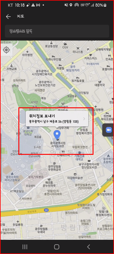 이 지도는 카카오맵과 연동되어 있습니다. [지도] 아이콘을 선택하면 사용자의 현재 위치가 찾아지면서 위치정보 보내기라는 팝업이 뜹니다. 물론 다른 위치를 찾아서 그 장소의 위치를 보낼 수도 있습니다. 오늘은 어제 일을 생각하면서 도서관에서 이 글을 작성하기 때문에 [광주광역시립사직도서관]의 위치를 보내게 됩니다.