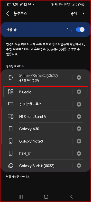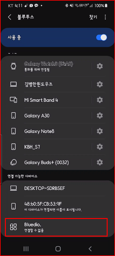 이 상태에서 연결을 시도하기 위해 해드폰의 전원을 넣고 아래 [연결 가능한 디바이스]의 [Blueedio]를 선택합니다.