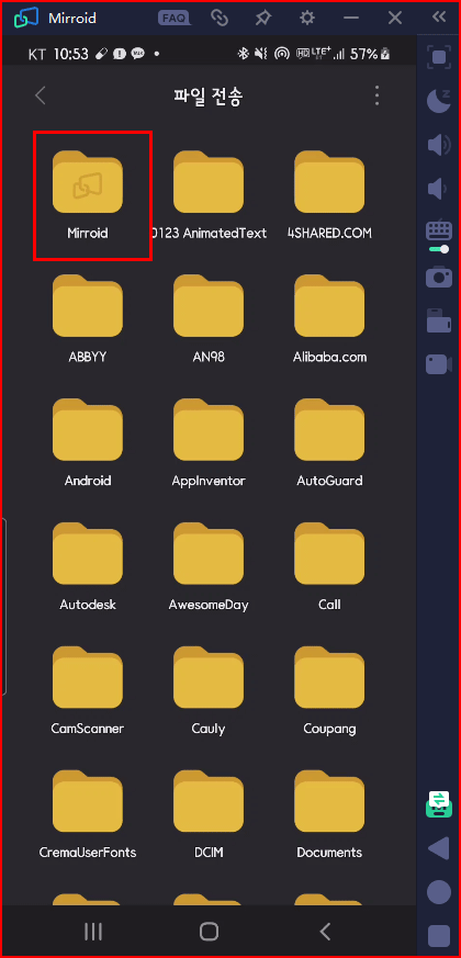 탐색기에서 해당 폴더를 마우스로 선택하여 잡고 드래그합니다. 어디까지? 바로 스마트폰미러링 화면의 아래 폴더까지 드래그합니다. 드래그한다는 것은 마우스 왼쪽을 누른 상태로 쭈욱~ 끌어간다는 것입니다. 과정은 보이기 힘들지만 아래 두 이미지를 비교하면 짐작할 수 있을 것입니다.