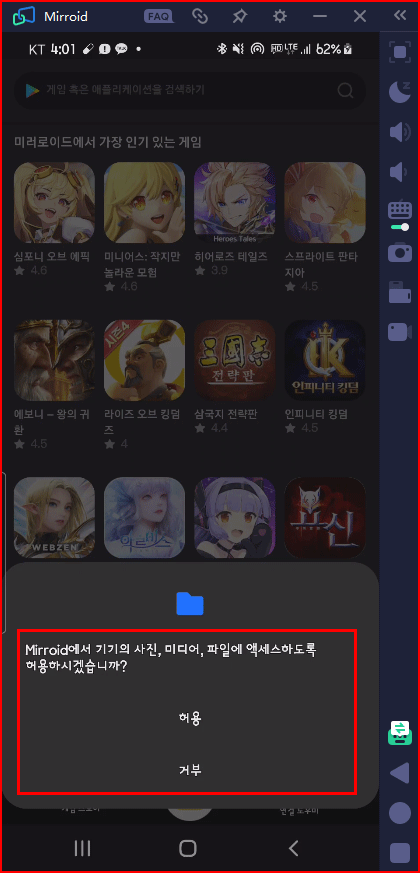 파일 전송을 처음 시도하는 경우는 위와 같이 액세스 권한을 허용해야 합니다. [액세스 권한]이란 자신의 스마트폰에 내가 아닌 他(타)가 접근하는 것을 허용해야 한다는 의미입니다. 제가 어려운 한자 他(타)를 사용한 것은 사람뿐이 아닌 어플도 他(타)에 해당되기 때문입니다. 즉, 미러로이드가 내 스마트폰 저장공간을 액세스(접근) 할 수 있어야 작업이 이루어지는 거죠. 파일을 옮기고 폴더를 옮기는 것이 보통 일은 아니지 않습니까?